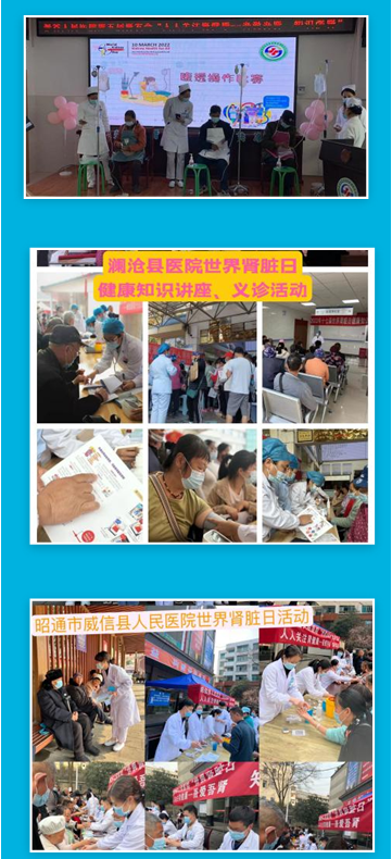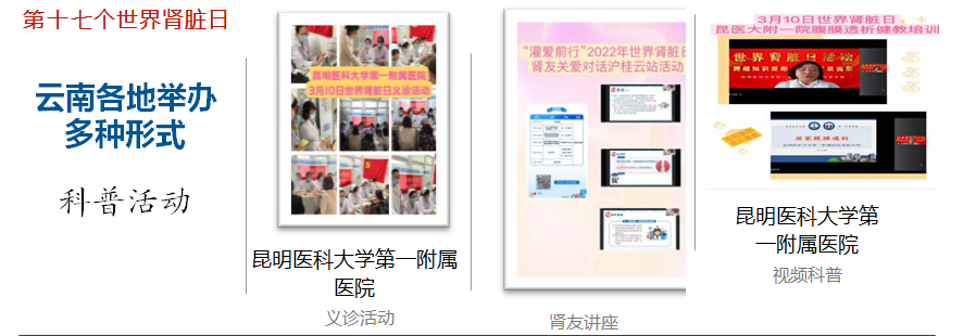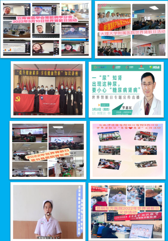 2022年3月10日是第⼗七个世界肾脏日,今年世界肾脏日的主题为:提升全民健康素养,⼈⼈享有肾脏健康。在云南省医学会肾脏病学分会的倡导下,云南省肾脏医师在全省各地,通过网络新闻媒体、动画与短视频,以及咨询、义诊、健康教育讲座、健康宣教手册与折页等线上与线下相结合的⽅式,全面开展多种形式,覆盖健康⼈群、患者及家属、卫生健康工作者的科普活动。我们携手向社会各界呼吁:改善公众日常饮食及生活方 式;赋能患者及家属,完善社会支持系统;提升基层医师对慢性肾脏病患者的全程管理能力;推动肾脏疾病公共卫生政策的制定与出台。全面提升⼈民对慢性肾脏病的认知, 关注自我肾脏健康,致力于⼈⼈享有肾脏健康。