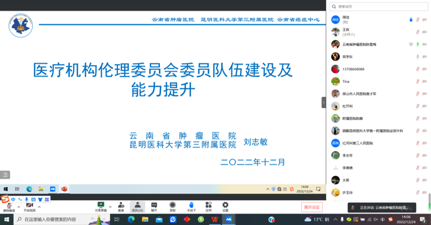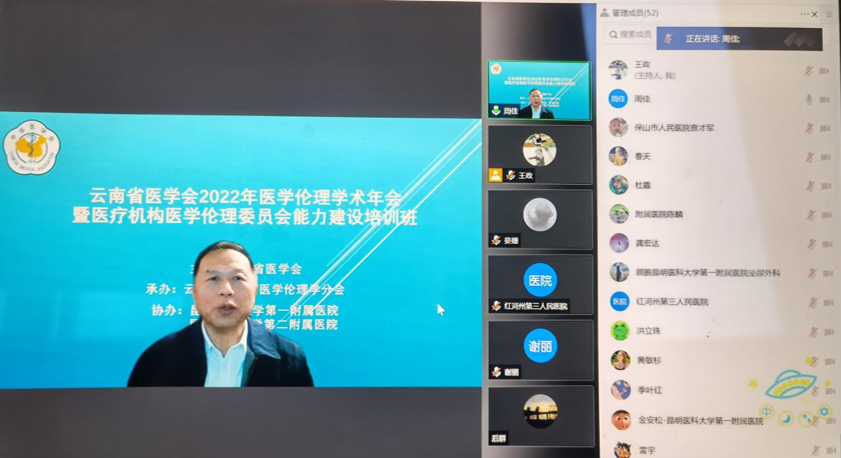 • 12月24日,“云南省医学会医学伦理学分会2022年年会暨医疗机构医学伦理委员会能力建设培训班”依托腾讯会议隆重举行。大会由云南省医学会主办,云南省医学会医学伦理学分会承办,昆明医科大学第一附属医院、昆明医科大学第二附属医院协办。云南省医学会医学伦理学分会主任委员、昆明医科大学党委常委、附一院党委书记周佳、云南省医学会医学伦理学分会第一届委员会全体委员及秘书,从事医学伦理学、社会医学与卫生事业管理、临床医学、药学等相关专业人员共计110余人参加会议。