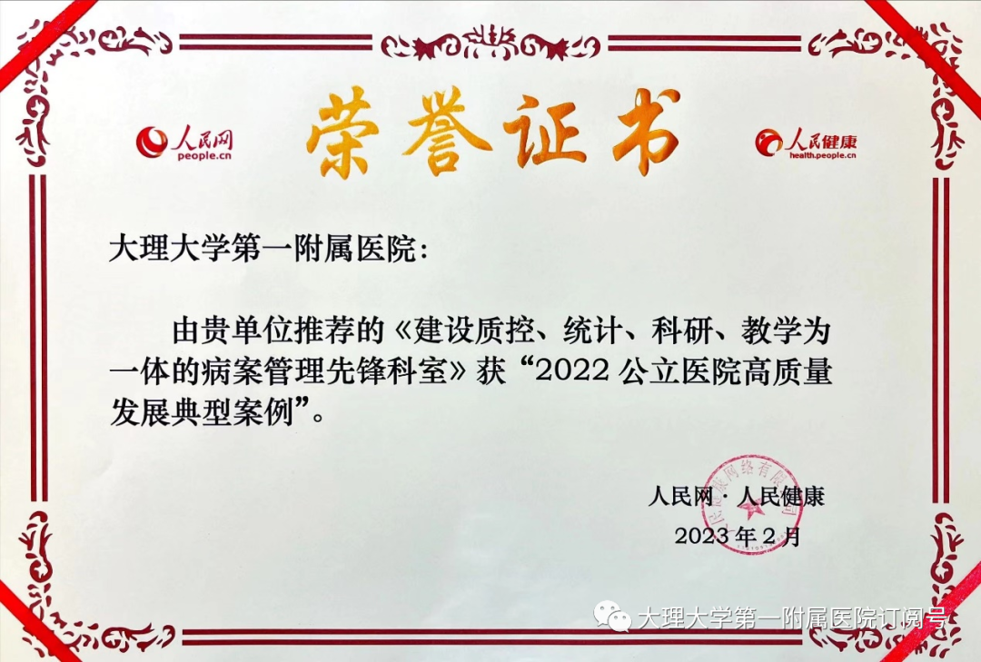 2月18日,大理大学第一附属医院病案管理科以《建设质控、统计、科研、教学为一体的病案管理先锋科室》为题申报的案例,荣获全国“2022公立医院高质量发展典型案例”。此次案例评选是由国家卫生健康委医政司委托,人民网·人民健康、重庆市卫生健康委在重庆联合举办的,旨在充分展现我国各级公立医院在推进公立医院高质量发展工作中付出的努力、取得的成效,发挥典型示范带动作用。大附院获奖案例是医院病案管理科近五年来在病案质控、病案数据统计、病案科研、病案信息管理教学等方面实践探索的总结。经过五年的发展,王靖博士带领的病案管理团队实现了病案数据低质量向高质量转变、病案数据单一利用向多元利用转变、基础型病案科室向“科研型”病案科室转变、病案专业教育欠缺向学科建设转变,充分体现了大附院在推进国家公立医院高质量发展进程中,积极加强病案管理学科建设,努力践行先进病案管理工作的创新实践,是用病案管理奠定医院高质量发展数据基石的典型范例之一。