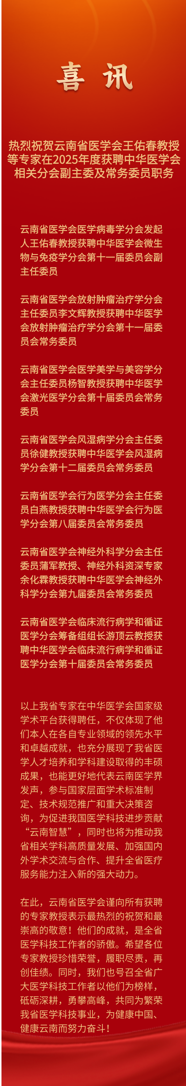 热烈祝贺云南省医学会王佑春教授等专家在2025年度获聘中华医学会相关分会副主委及常务委员职务