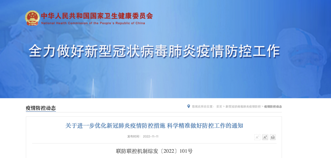 新冠肺炎疫情发生以来,在以习近平同志为核心的党中央坚强领导下,我国坚持人民至上、生命至上,坚持外防输入、内防反弹,坚持动态清零不动摇,因时因势优化完善防控措施,积极应对全球多轮疫情流行的冲击,最大程度保护了人民生命安全和身体健康,统筹疫情防控和经济社会发展取得重大积极成果。11月10日,中央政治局常委会召开会议听取新冠肺炎疫情防控工作汇报,研究部署进一步优化防控工作的二十条措施。为贯彻落实中央政治局常委会会议精神,抓好疫情防控和优化调整措施的实施,现就有关工作通知如下: