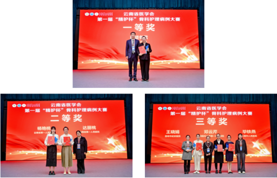 开幕式还举行了云南省医学会2025 年第一届 “精护杯” 骨科护理病例大赛颁奖仪式,由陆声教授、龚近秋教授、徐晓燕教授、金艳教授、王训怡教授分别为获奖者颁奖。